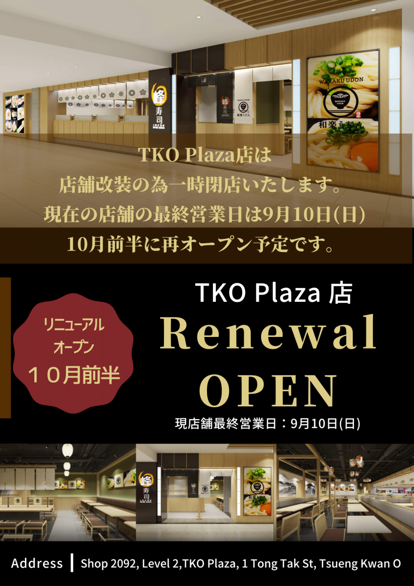 TKO Plaza店は9月11日より改装の為一時閉店いたします。